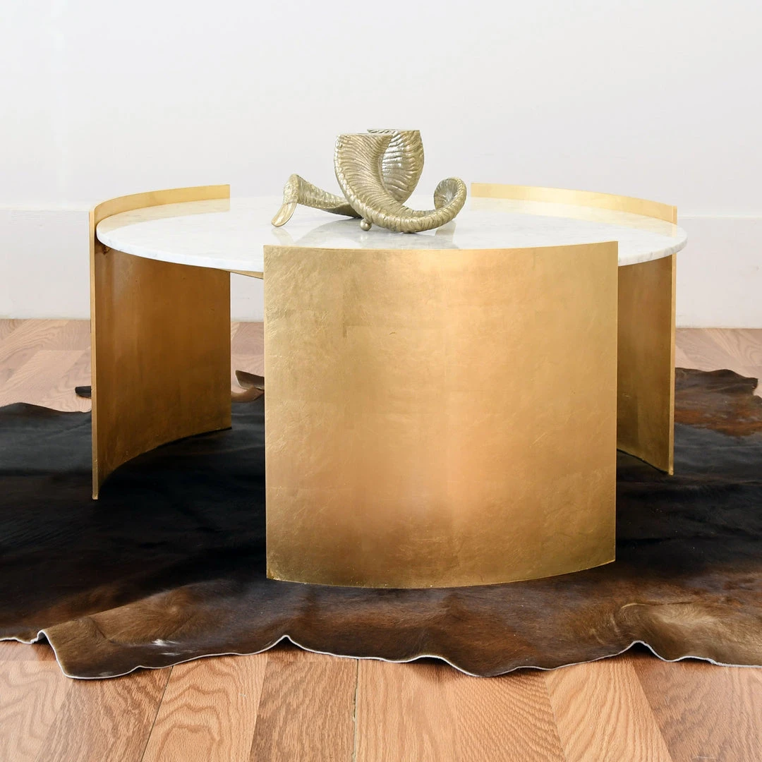 Looking for a round cocktail table with a high-style profile and durable, luxurious composition? Look no further than our extraordinary, statement-making Montana Cocktail Table in Gold Leaf from Worlds Away. Three gold leaf sculptural forms enclose a luminous white marble top, creating a look that is simultaneously grounded and gravity-defying.