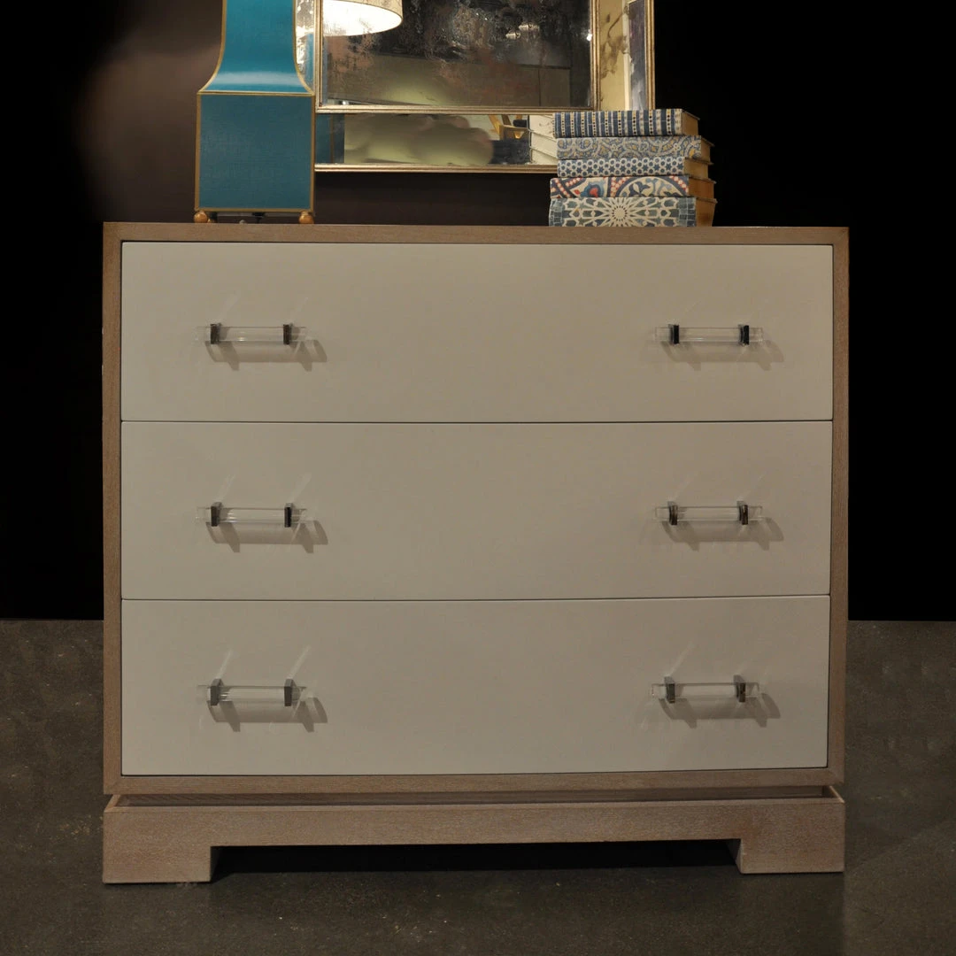 The Worlds Away Whitney chest offers everyday functionality and elegant design. The Whitney features three, matte white lacquer drawers and a sophisticated cerused oak finish. Sleek acrylic hardware completes the look. Place the Whitney Chest in the bedroom for all of your storage needs. The easy to open drawers make functionality the best part of these pieces by Worlds Away.