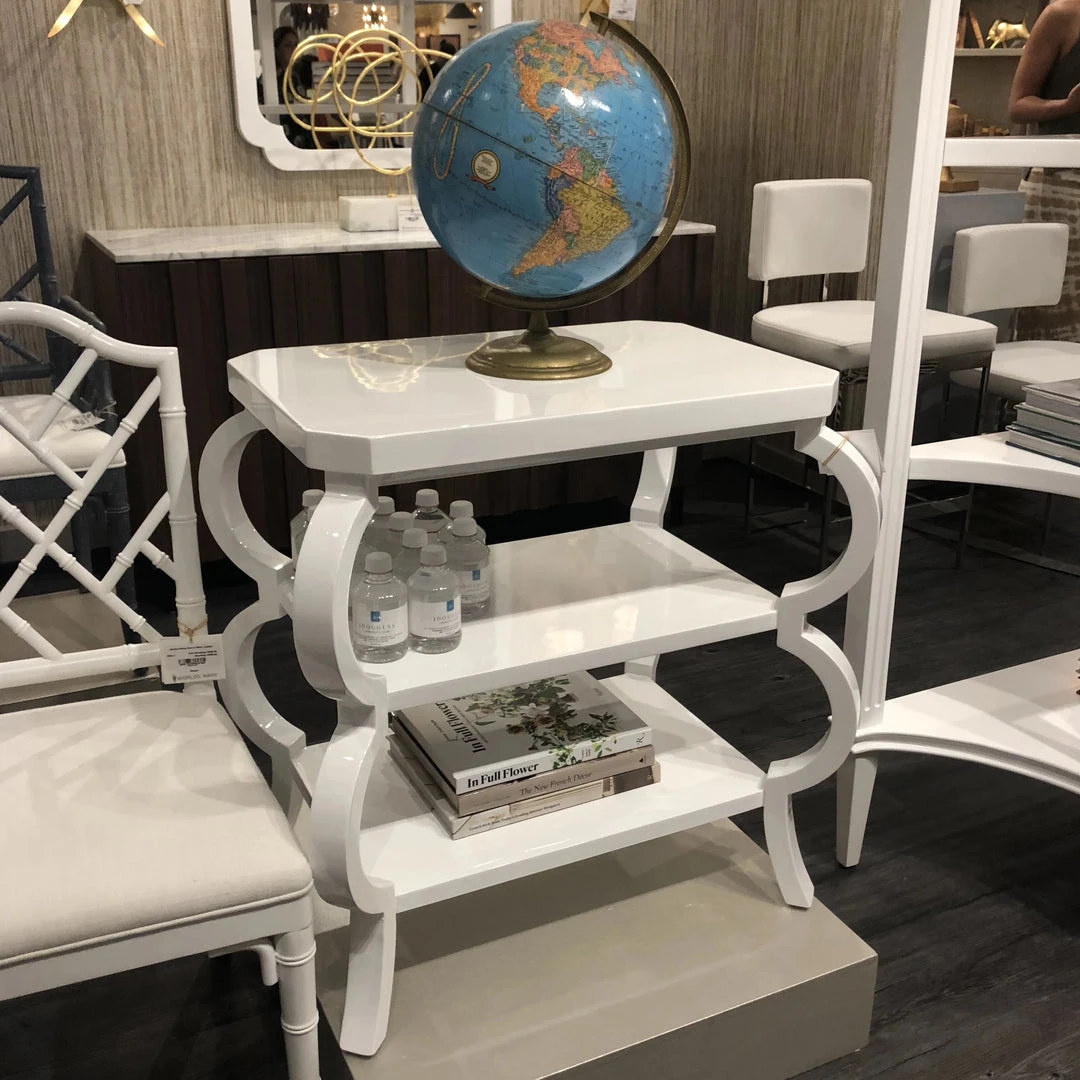 The Olive Side Table from Worlds Away is presented in a chic white finish bringing style and functionality to any room in your home. Â The Olive offers a three shelf design making this accent table as functional as it is beautiful. Side tables like the Olive from Worlds Away work well in living spaces, bedrooms and home offices.