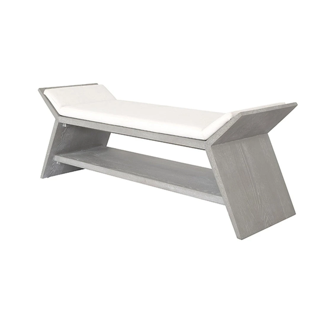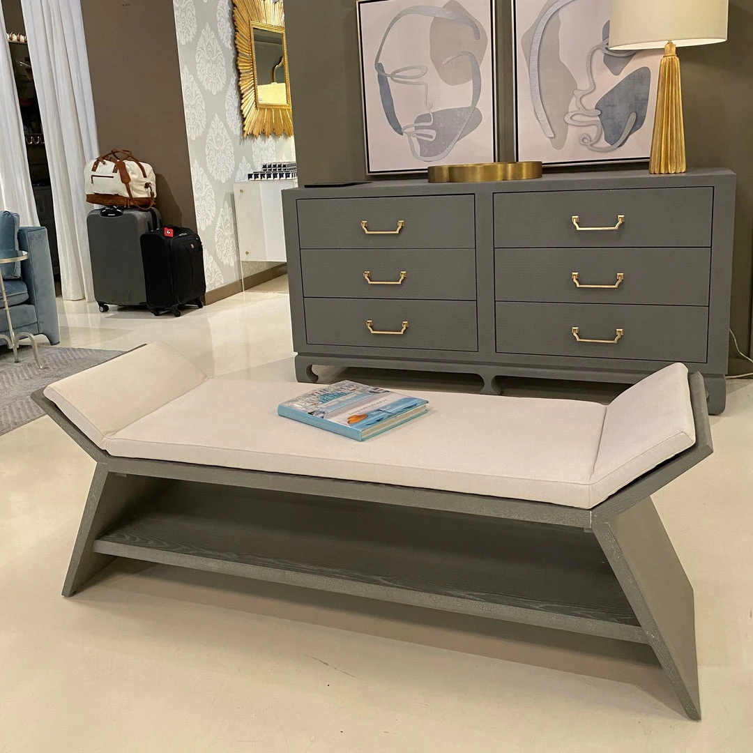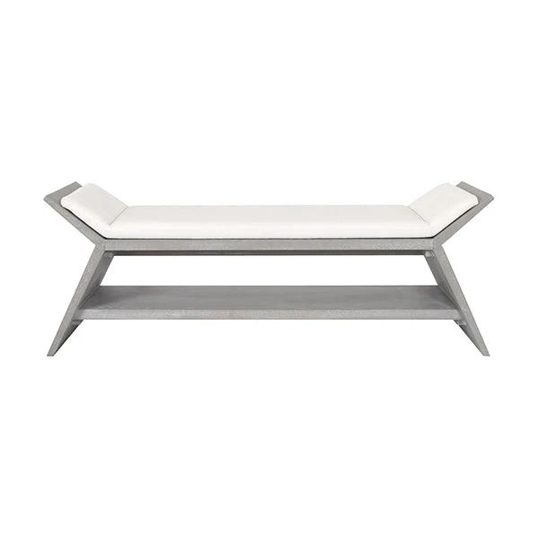 The French Art Deco-inspired Peria Bench in Grey Cerused Oak from Worlds Away is luxe at first sight. Bold angular shape provides an ideal canvas for its grey cerused oak finish, and white linen cushion conforms to the top frame for a clean, modern profile. Sure to impress as a statement in your living or keeping room.