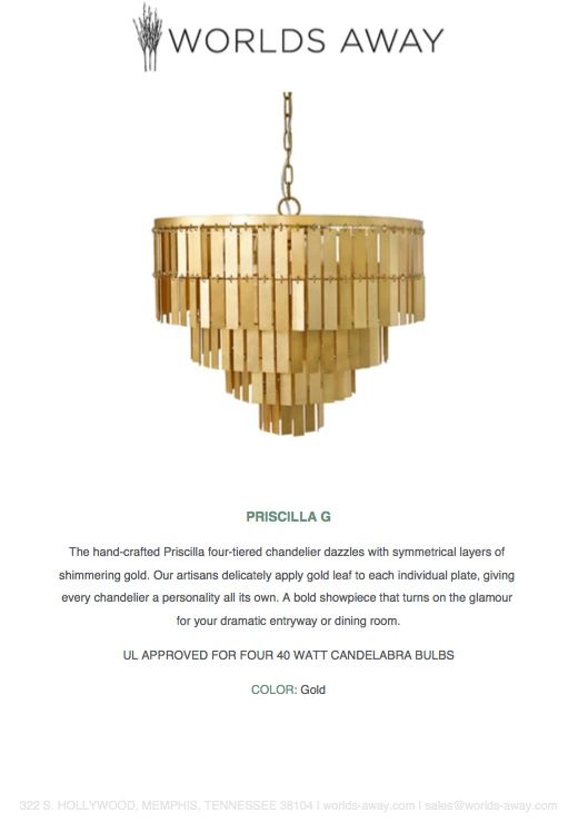 The hand-crafted Priscilla Chandelier in Gold Leaf from Worlds Away dazzles with symmetrical layers of shimmering gold. Artisans delicately apply gold leaf to each individual plate, giving every chandelier a personality all its own. A four-tiered bold showpiece that turns on the glamour for your dramatic entryway or dining room.