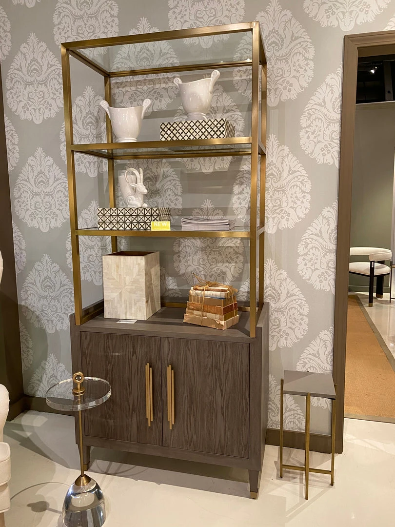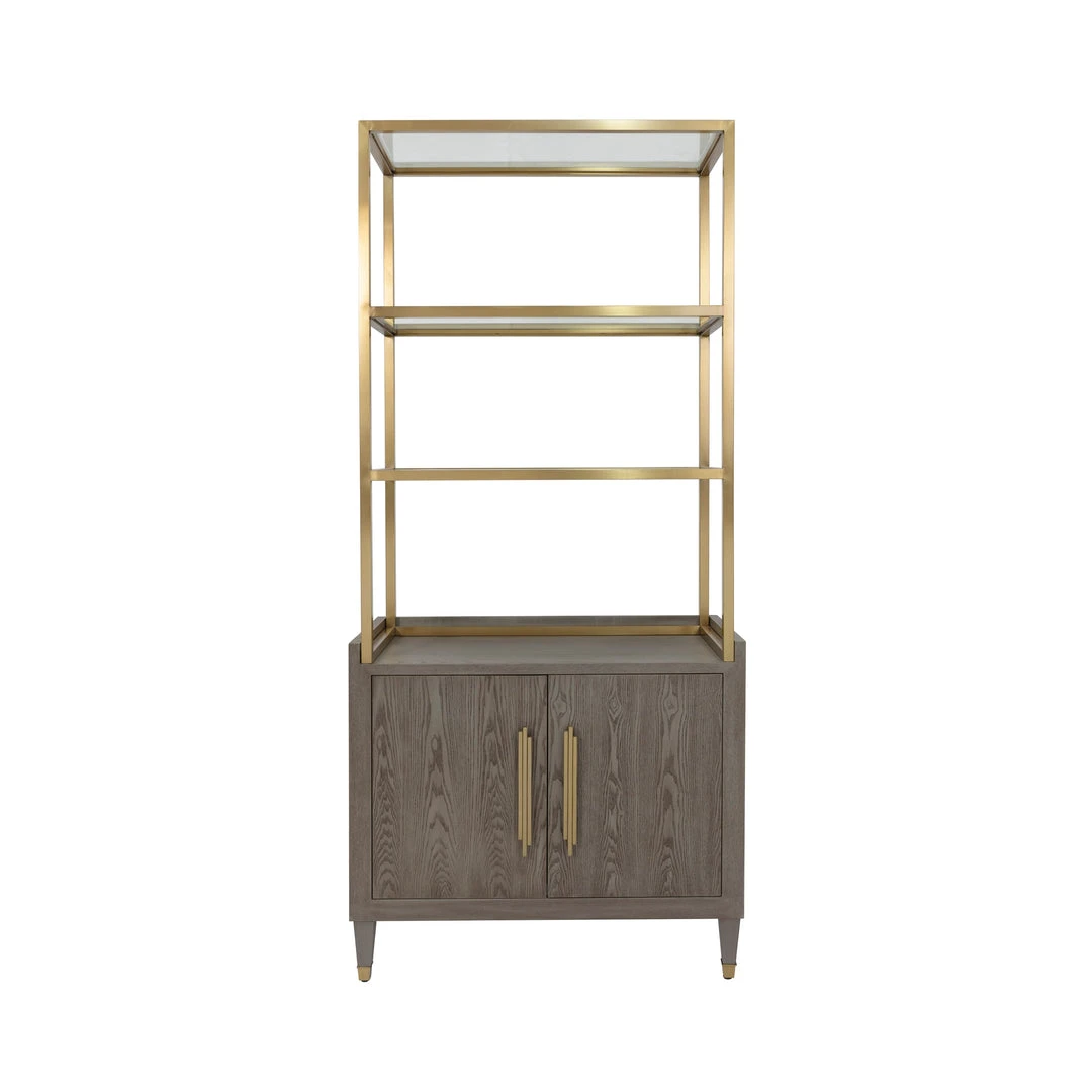 Perfect for home offices, dining rooms, or living spaces, the Rivaa Etagere in Smoke Grey from Worlds Away features a smoke grey cerused oak base with a brushed brass frame topper. Three inset glass shelves are generously sized to accommodate all your books and stylish objects. Deco-styled antique brass hardware and foot caps finish the flawless look. A designer favorite for its versatility and style.