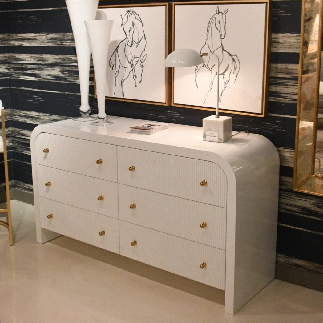| Materials | White Lacquer; 6 Drawers; Antique Brass Hardware; Waterfall Edge; Fluted Drawer Front |