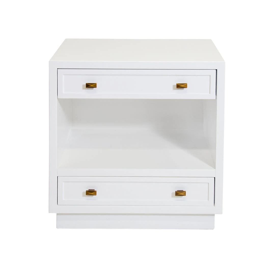 The lovely Warren Nightstand from Worlds Away features a simple white design. The square frame supports two drawers for ample storage. Place the Warren side tables in the bedroom or living room and top with your favorite lamp. Bronze hardware on the Warren give the side table a finished look.